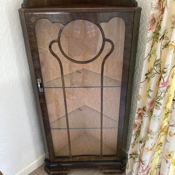 Antique wooden corner display cabinet with inlaid door, over 100 years old.